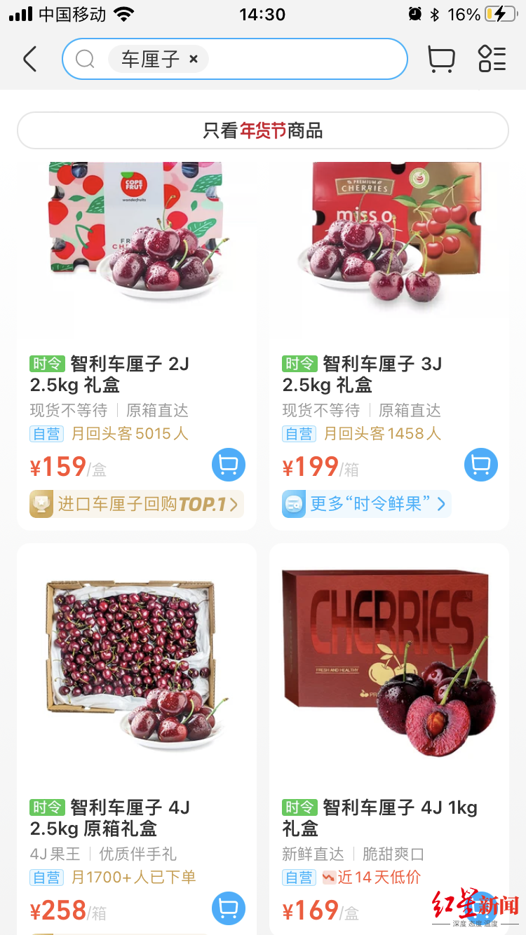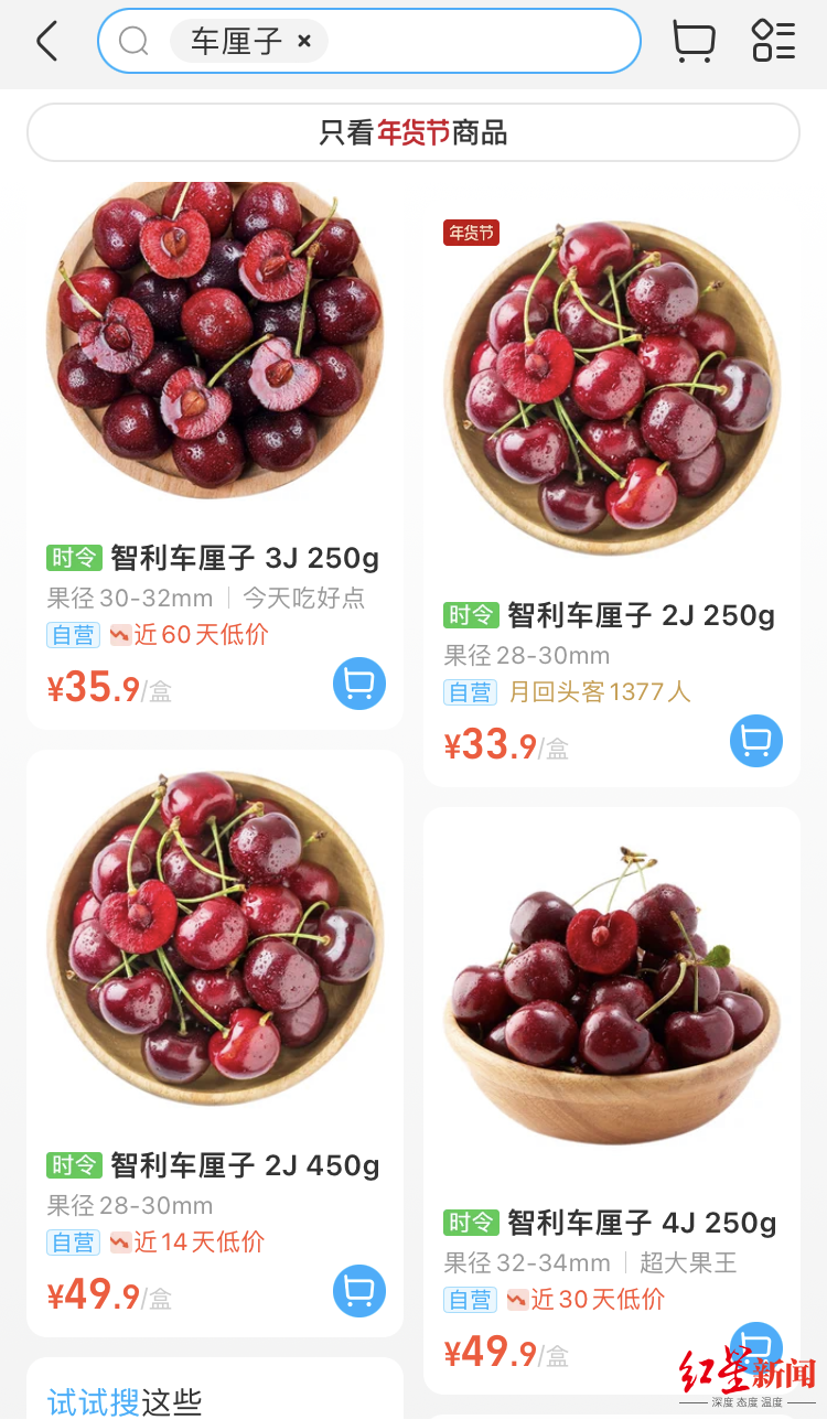 由于到货量增加,多个线上平台和线下门店的车厘子价格正在持续下探。进入12月以来,山姆的车厘子已经经历3轮降价。由12月2日的158.9元/907g(2J级)一路降至12月13日的115.9元/907g。不到两周,降幅达27.06%。12月30日,盒马APP上 2J级2.5kg礼盒装智利车厘子已降至159元,而在12月6日,该产品售价369元;3J级2.5kg礼盒装已降至199元。两种折算下来31.8~39.8元/斤,其他电商、网购平台车厘子价格也均有所下降。
